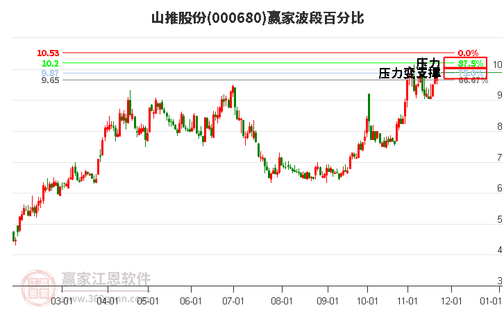 ★依据赢家江恩波段百分比工具展示:短期处于上涨趋势,当前该股突破波段百分比工具所显示的9.87元,如此线支撑不破,上方压力关注10.2元。