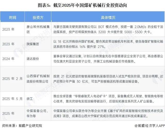 近三年煤矿机械行业投资聚焦智能化、绿色化与全球化,头部企业和能源集团是投资主力,一方面通过自建高端装备项目、跨界联合科技企业攻关智能系统等强化核心技术,另一方面通过并购整合产业链与布局海外子公司拓展市场,同时发力后市场服务与新能源矿用装备,推动行业向高质量转型。