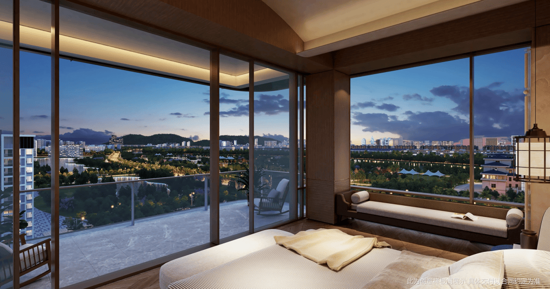 巨幕揽景:作为三亚首个新四代宅,该户型也采用了全景舱设计,拥有270度环幕视野,约41㎡观景阳台,可将窗外的山河城园尽收眼底。